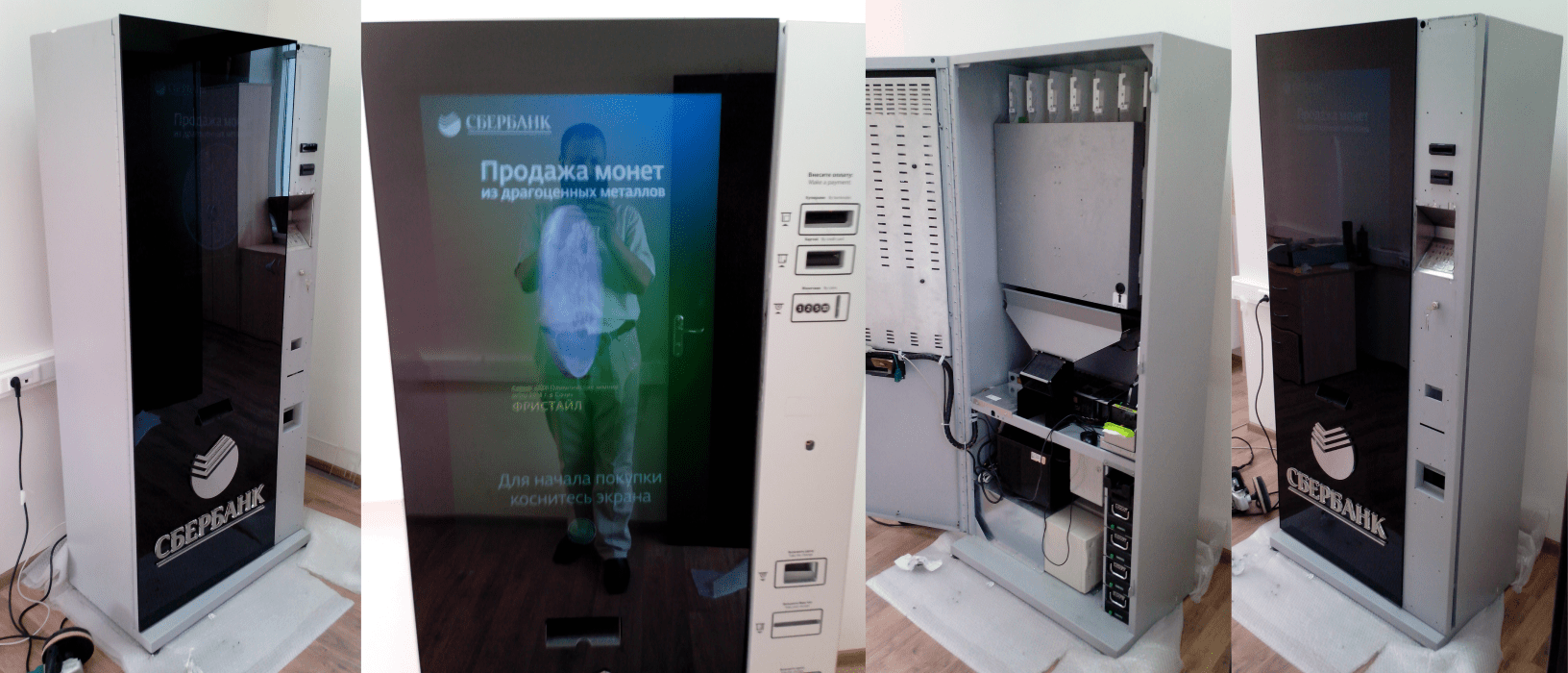 Автомат предназначен для продажи сувенирных монет или подарочных карт. Имеет 32" сенсорный монитор, платежную систему, включающую: