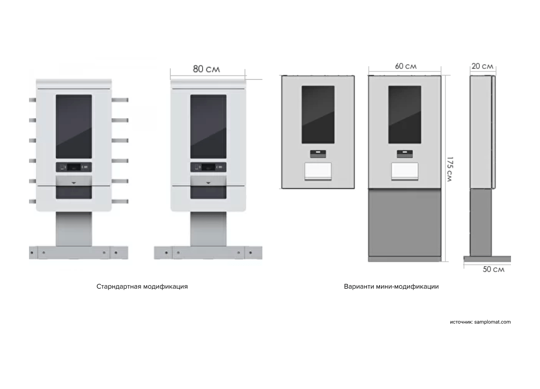 Конструкция, вдохновленная торговыми автоматами, существенно переработана и усовершенствована. Сэмпломат представляется в 3-х модификациях, которые применяются в зависимости от места установки автомата и вида продукции. Автомат адаптируется под любое расположение в торговом зале, встраиваясь в доступное пространство путем использования приставных модулей и дополнительных навесных полок. Для небольших площадок, где нельзя вместить Сэмпломат стандартной модификации, можно установить мини версию, которая может висеть на стене или стоять на подставке.