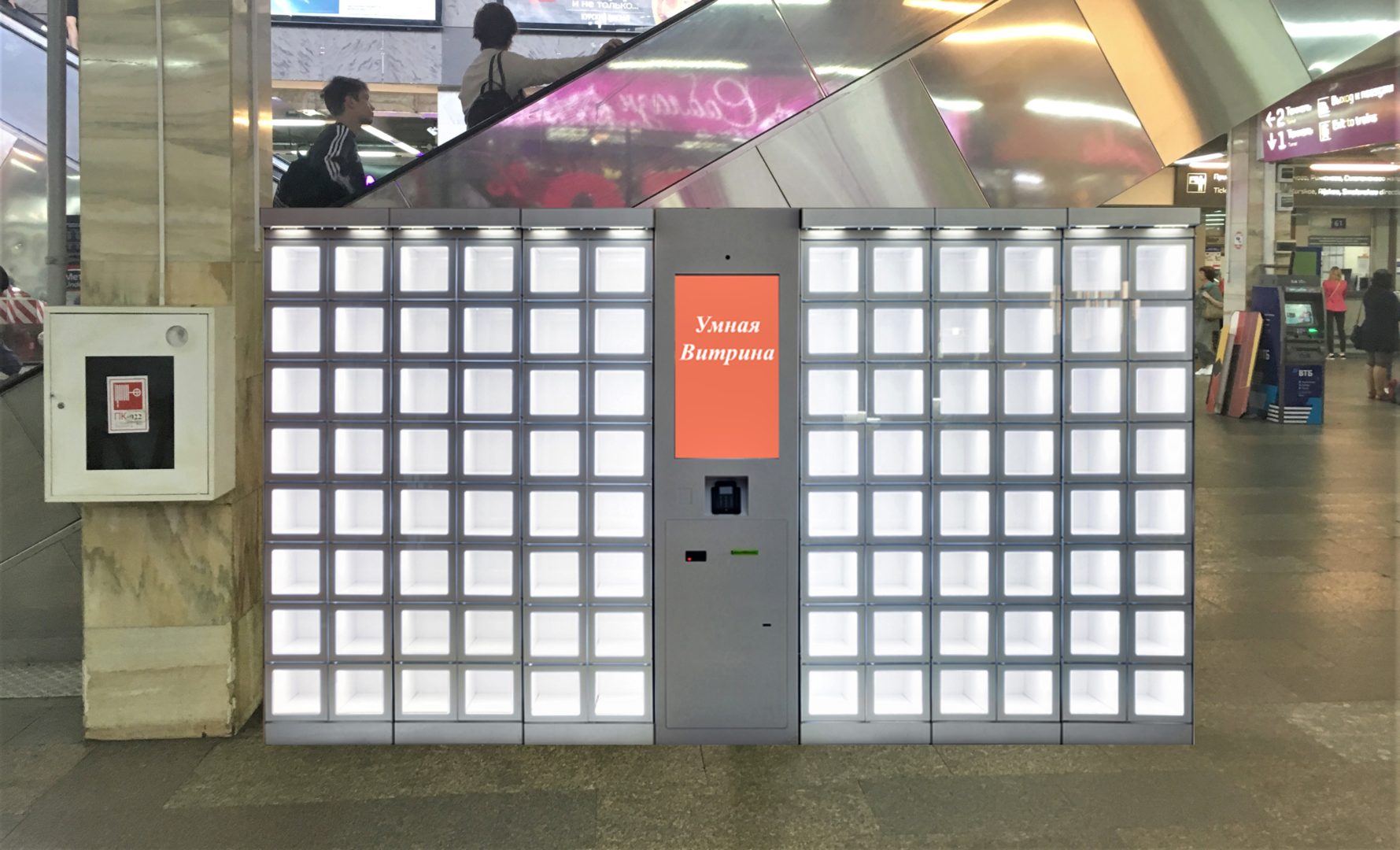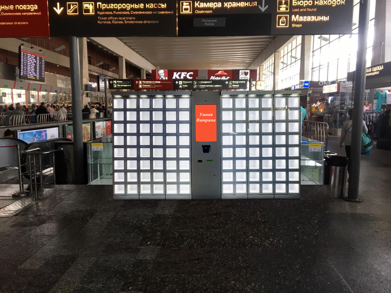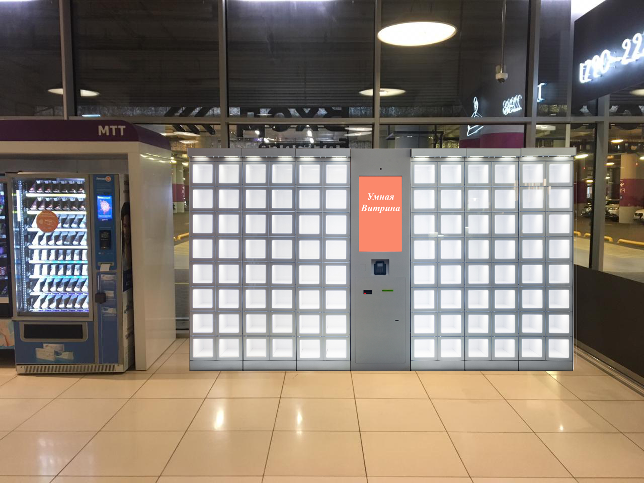 «Умная Витрина» – магазин постамат, работающий в режиме 24/7 с короткими перерывами для пополнения следующими товарными единицами. Реализуются часы, телефоны, аксессуары, подарки, сувениры, косметика, парфюмерия, товары в дорогу и многое другое.